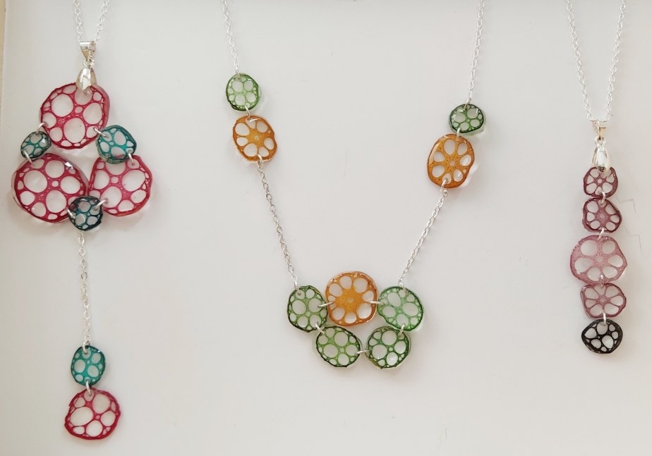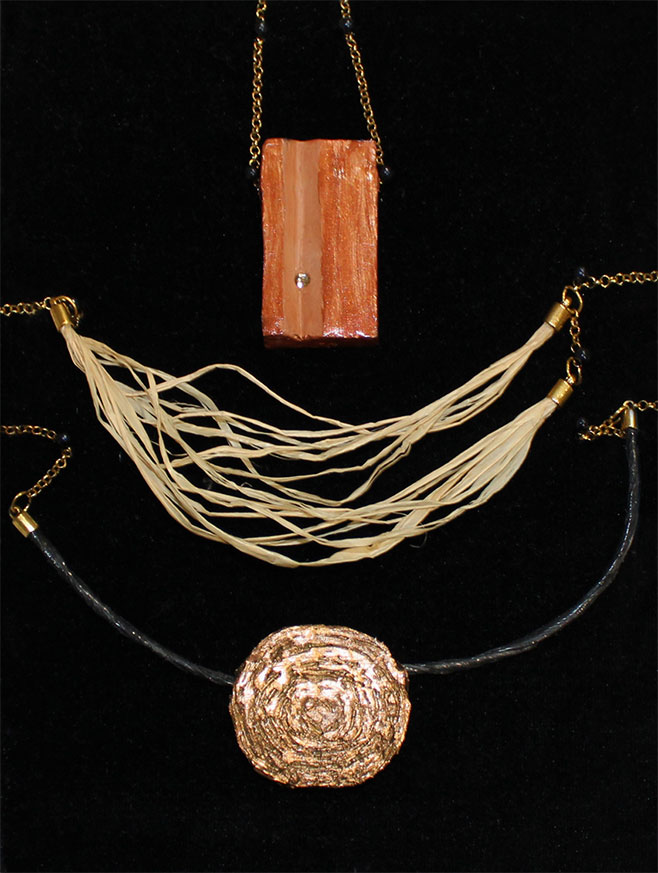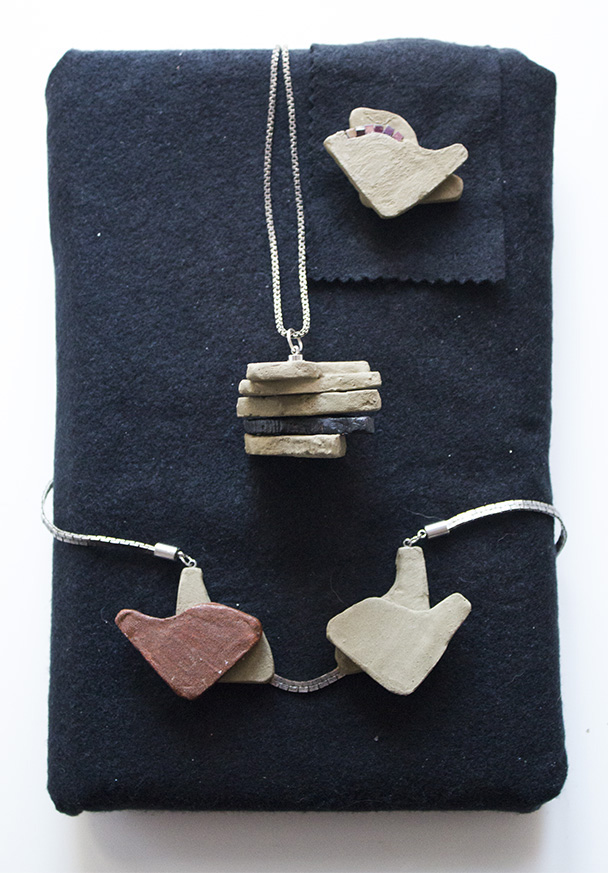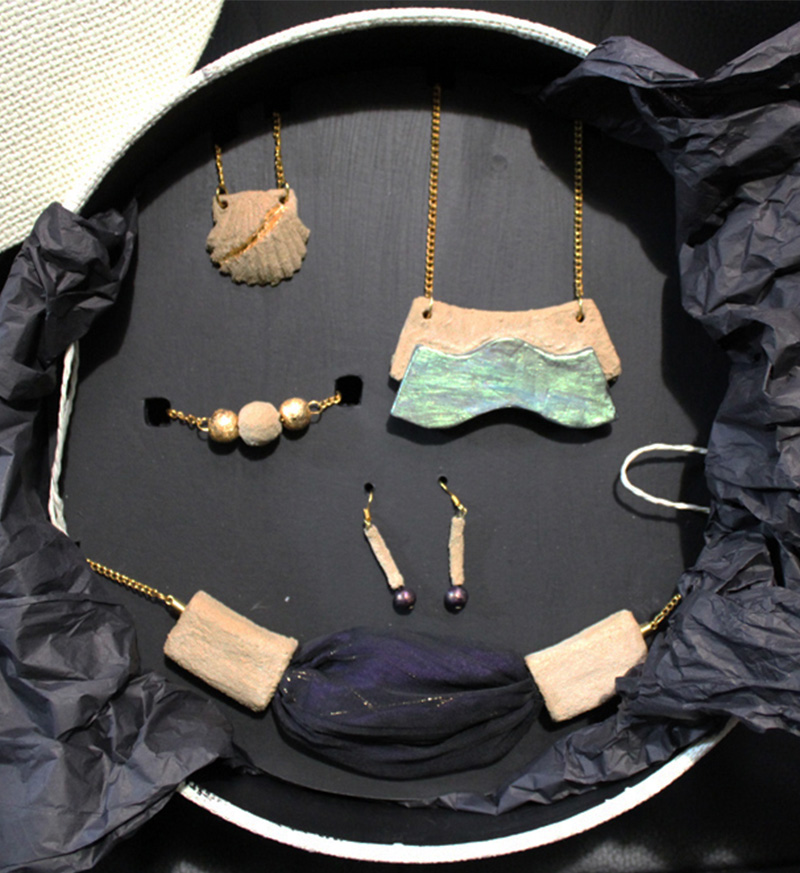 Concibo los complementos como pequeñas esculturas, portables sobre uno mismo, mayoritariamente realizados en cerámicas lacadas, pero también influidos por la experimentación con cualquier tipo de material. De inspiración natural, en los paisajes y arquitecturas vinculados a mi propio entorno y a la artesanía tradicional.