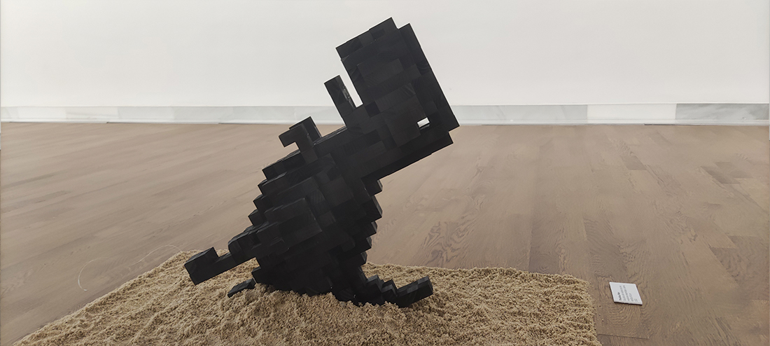 Escultura con forma de Tyrannosaurus rex sobre una superficie de arena. Este conjunto nos recuerda al popular Dinosaurio de Google, perteneciente al videojuego que aparece en el navegador Google Chrome, cuando el usuario se encuentra sin conexión a internet, siendo este navegador el más utilizado a nivel mundial con dos tercios de la cuota global de mercado.