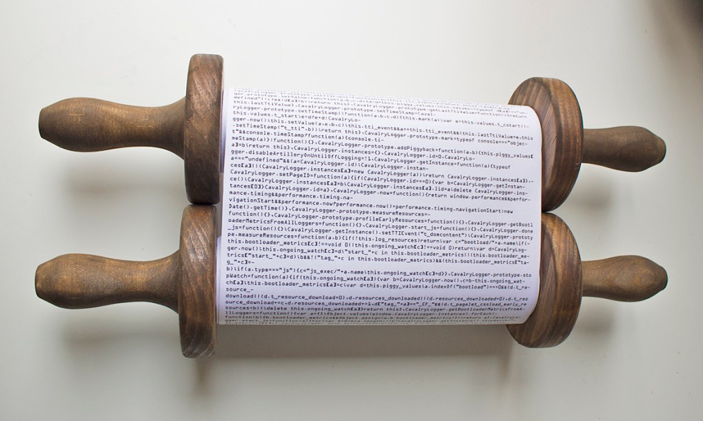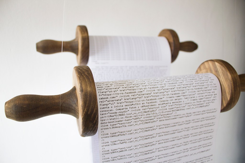 El título de esta obra traducido desde el latín significaría Sagradas Escrituras y es que esta forma de rollo se asemeja a los rollos de la Torá, que contienen la ley y el patrimonio identitario del pueblo judío. Sin embargo al tratarse del código fuente de las páginas más usadas actualmente, tanto para búsquedas de respuestas como para uso de relaciones sociales, se podría deducir que aquí se presenta un rollo propiamente identitario de la sociedad post digital.