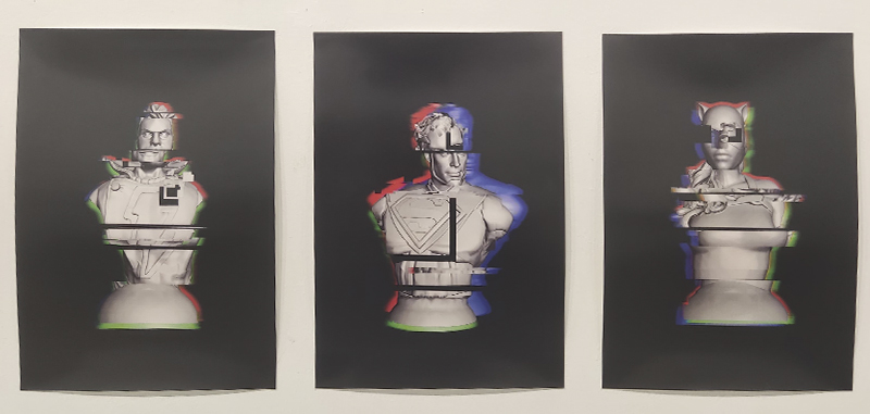 Serie de 14 impresiones de imágenes de bustos blancos de superhéroes intervenidos con estética de error digital o Glicth.