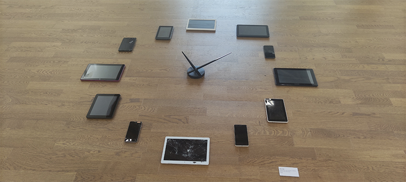 Compuesta por agujas de reloj de 60 cm de diámetro y doce tablets y móviles rotos de diferentes tamaños, colocados en el lugar de los números del reloj.